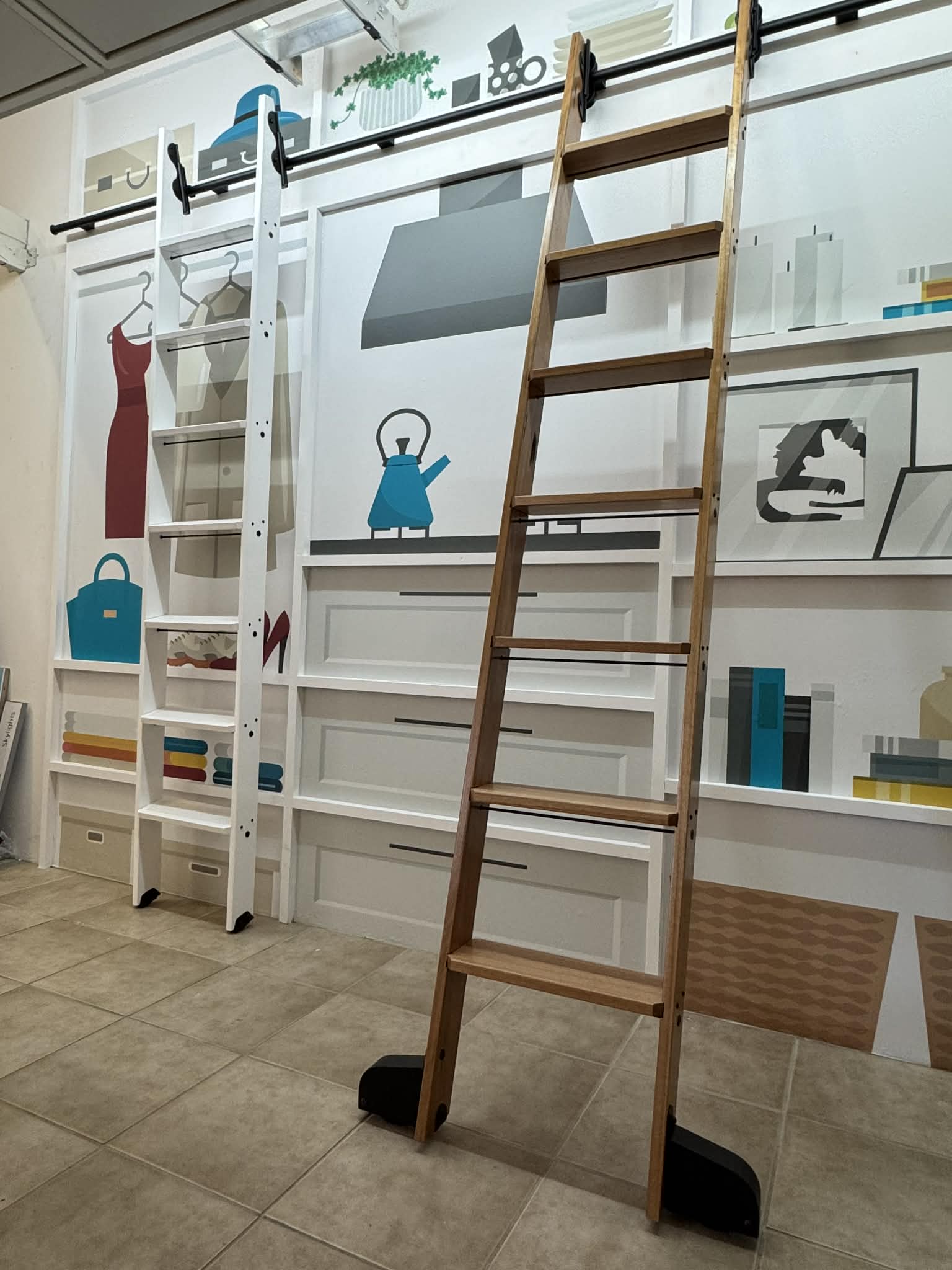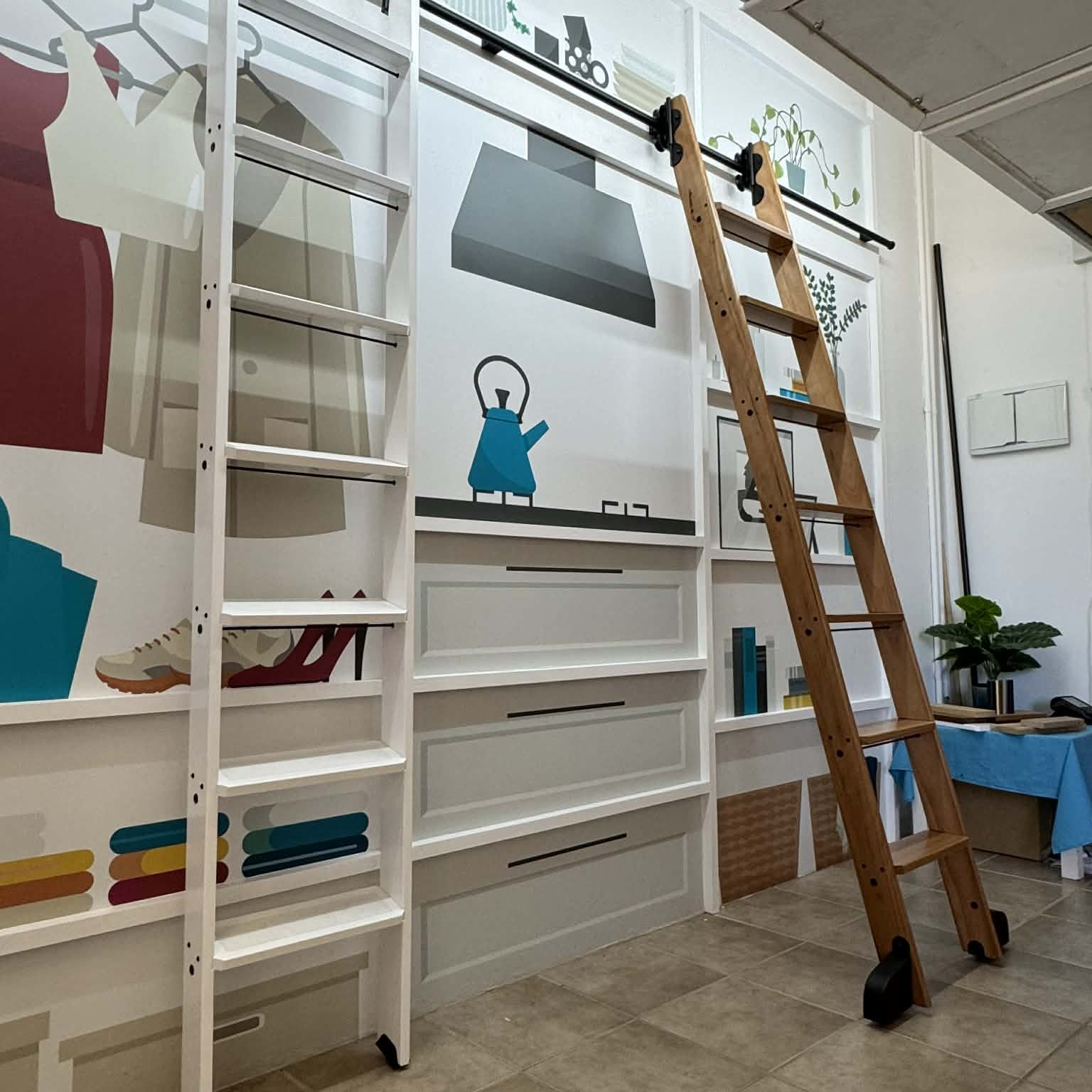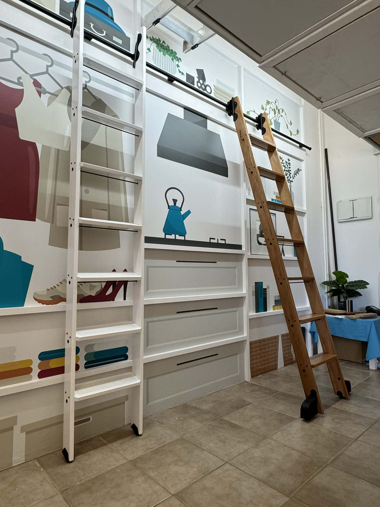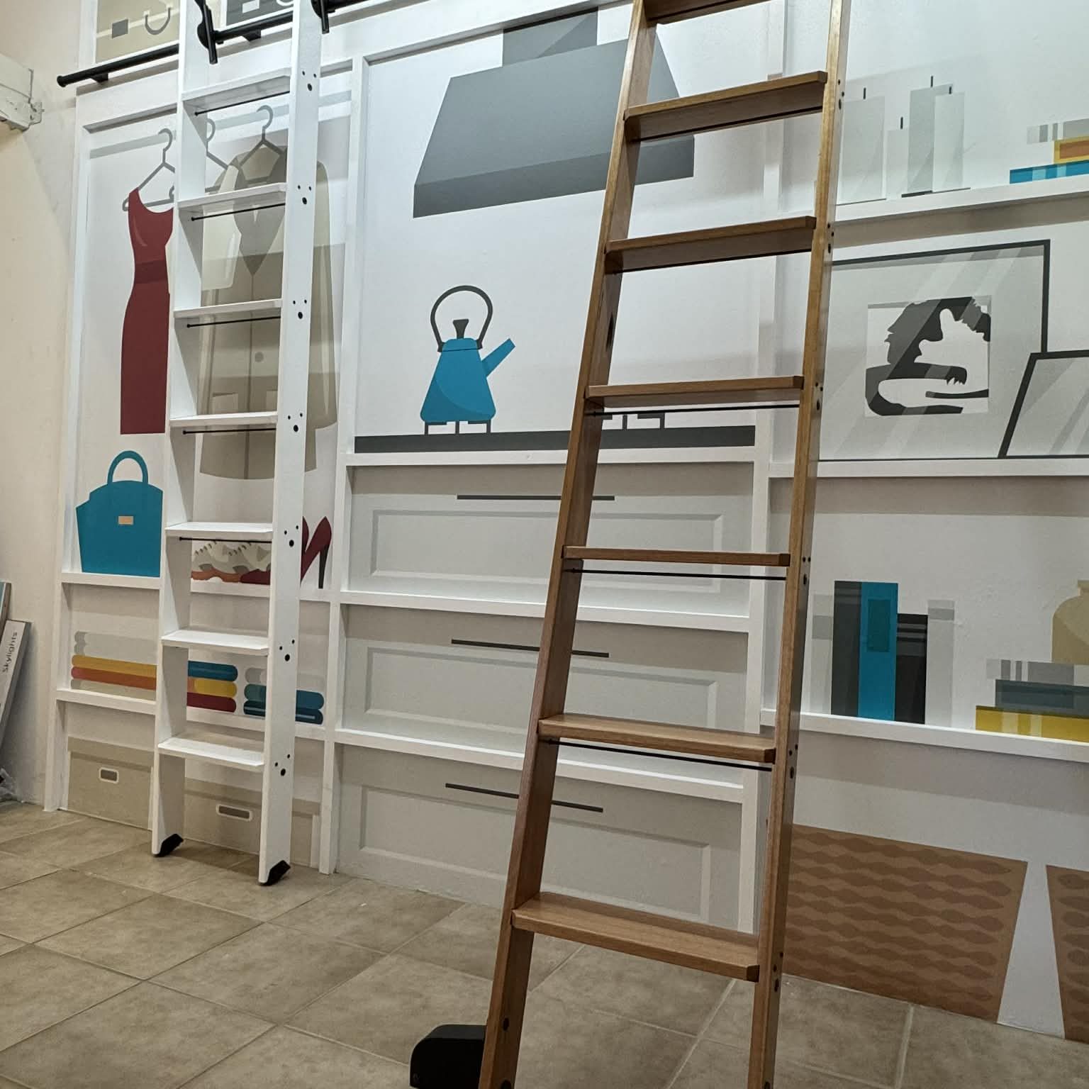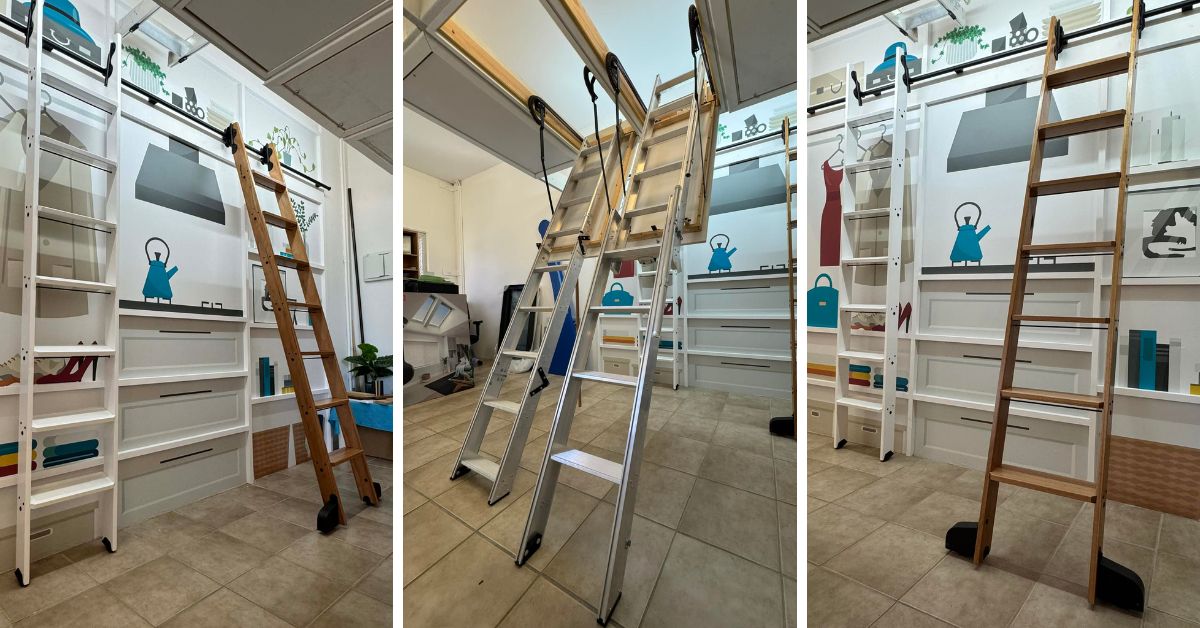 Library ladders and attic ladders side by side